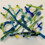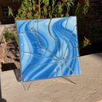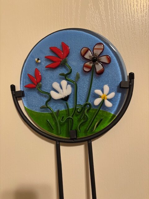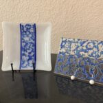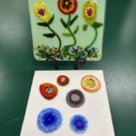 Create a field of wildflowers on your choice of an 8” square plate or a 6” x 10” plaque pre-fused blue and green base. Using assorted colors of glass scraps, frit, stringers, noodles and vitrograph. Fused flat. The 8” square will be slumped in a mold. The 6×10 will remain flat to display on your stand.