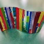 Learn to use the “Glass Shop” strip cutter. On a clear base and choose 2 accent colors for the strips. Fused flat, then slumped in a mold.