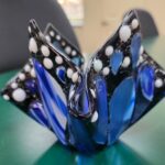 Beginners get started with introduction to fusing information, glass cutting, etc. On a 6” square clear base, decorate with assorted glass colors, frit, etc. Fuse flat, then slump or drape to make a votive or candy dish.